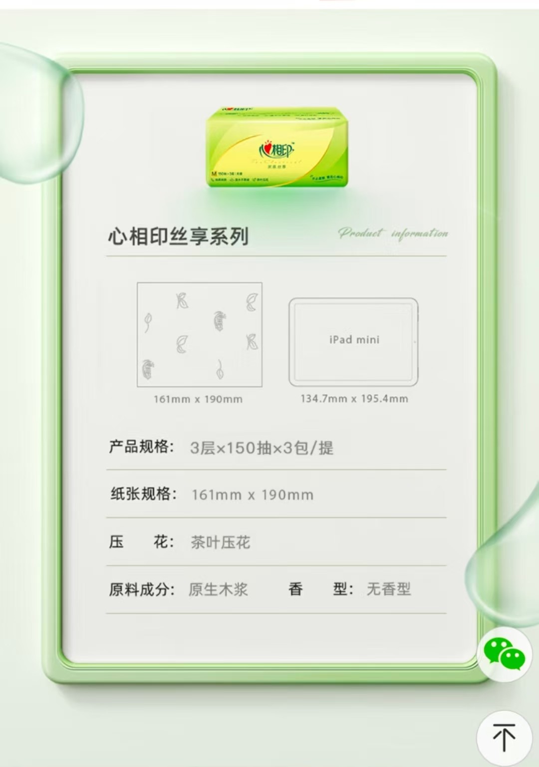 心相印/MindActUponMind DT32150 软包抽取式面纸软包抽取式面纸 (提装)茶语丝享系列150抽 抽纸3包/提 自营