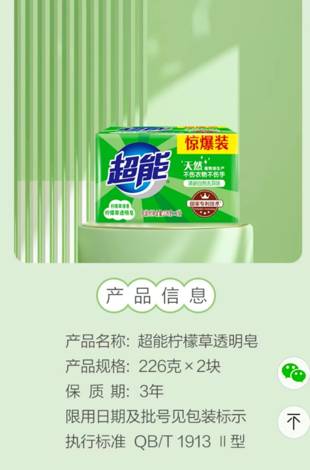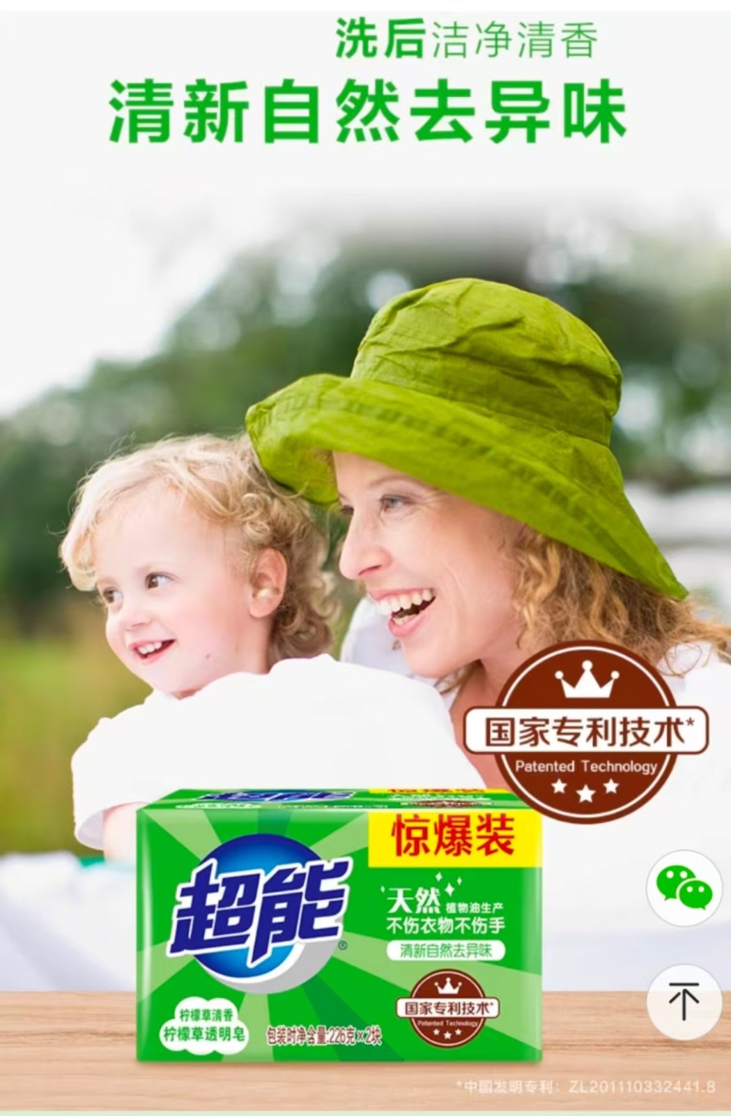 超能 226g 香皂 清新自然去除衣物异味柠檬草清香透明皂 自营